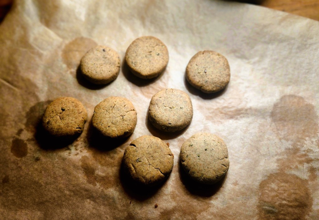 Once they are dried, crush them as fine as you can, to personal preference. I like a little grit in these cookies and crush them by hand as to spare some of the seeds, but you can grind them in a small blender to make a finer powder.