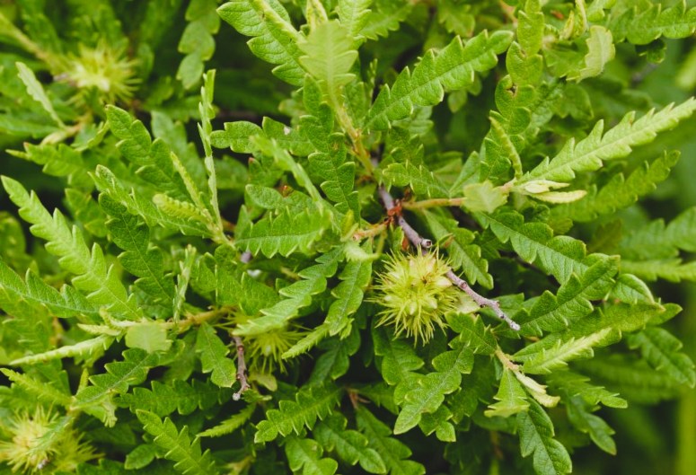 Sweet fern (Comptonia peregrina) is an interesting shrub; native to the eastern United States, adapts well to poor soil conditions, and has a wonderful aroma throughout early-to-mid-summer. If you look closely, you’ll notice that the flower you smell is amazingly bizarre, like a bright green spikey ball, or a misplaced sea creature… or something that might turn into the Lorax. And believe it or not, these little flowers are perfectly edible and add a very cool spin to the common tea cookie.