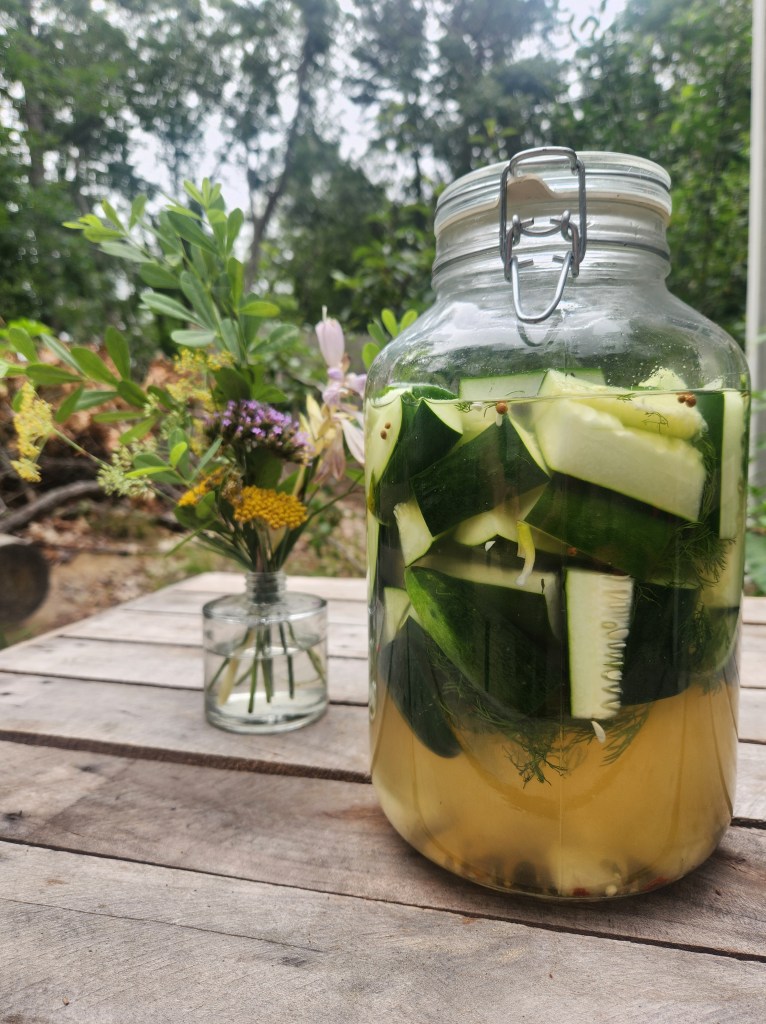 - Several (6-9) medium sized cucumbers at least slightly seeded and quartered (no soggy doggies here, you want the freshest and firmest for a crunchy pickle… trust me)