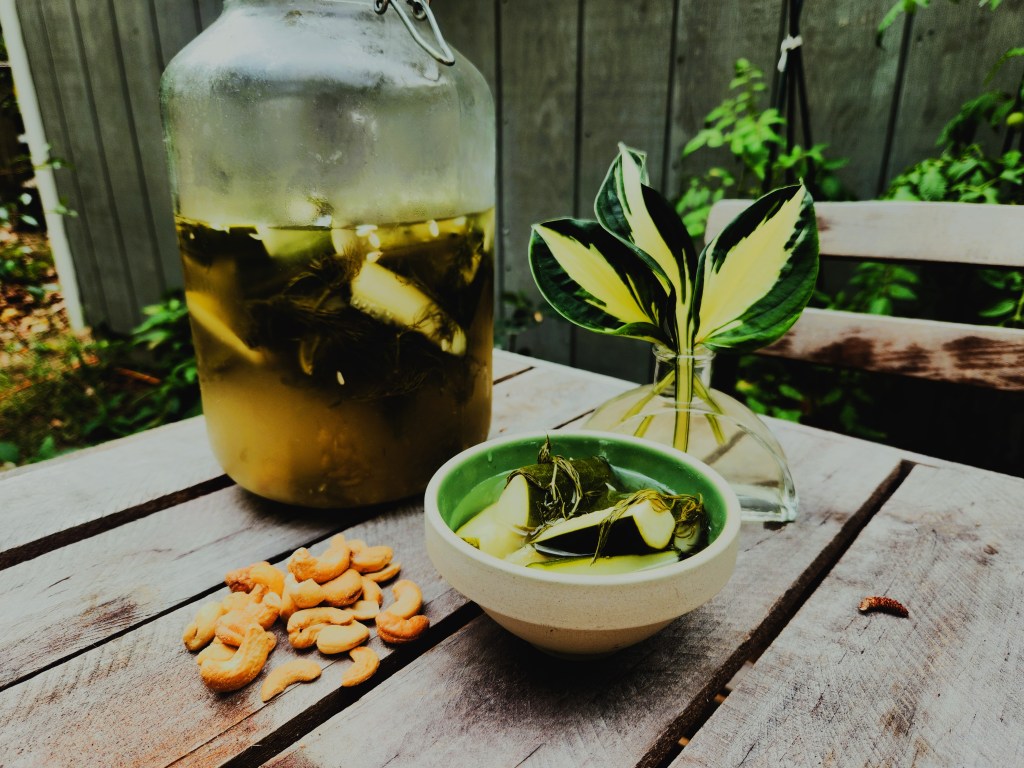 Once the brine is cool and your jar(s) is/are good to go, add all of your ingredients to the jar(s). From here, you will either: